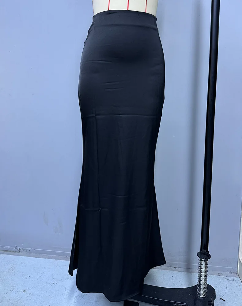 Women Ribbon Satin Long Skirts Summer High Elastic Waist Pleated Fake Mermaid Skirt DFFZ-B0038